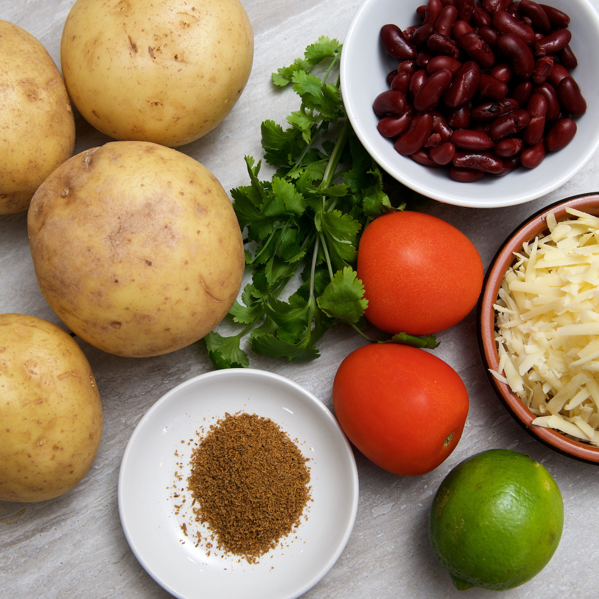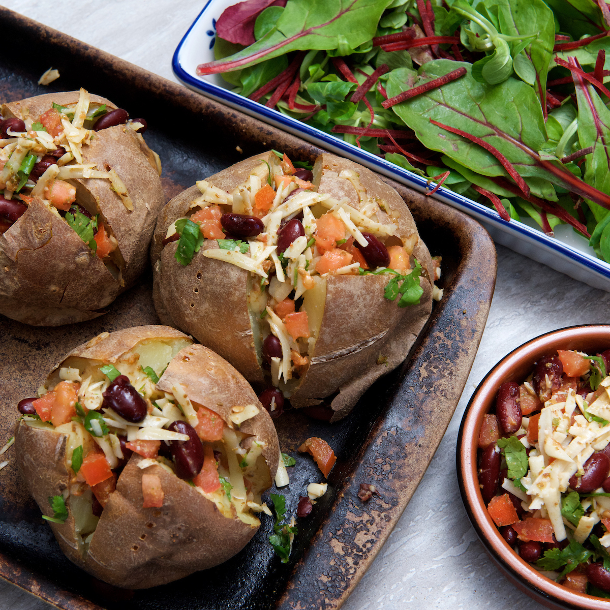 Mix the Cheddar cheese, kidney beans, tomatoes and coriander together. Add the lime zest and cumin then mix well to combine. Remove the potatoes from the oven and make a cross in each potato and split open. Spoon the cheese mixture into each jacket potato and sprinkle with a pinch of chilli powder if desired.